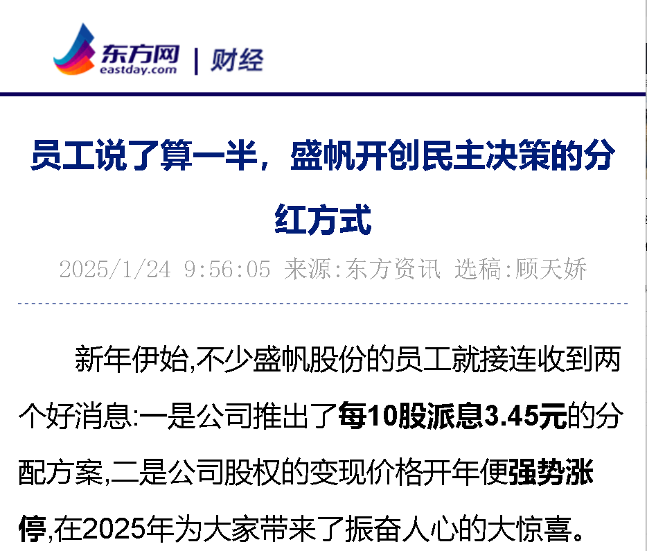 新年伊始,不少盛帆股份的員工就接連收到兩個好消息:一是公司推出了每10股派息3.45元的分配方案,二是公司股權(quán)的變現(xiàn)價格開···