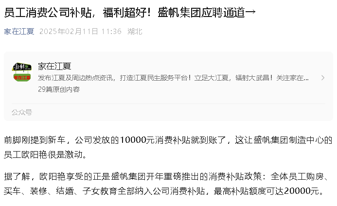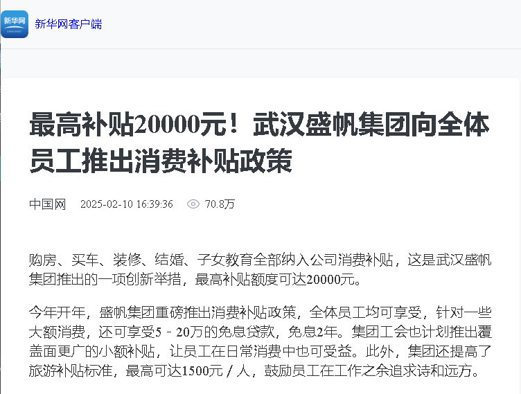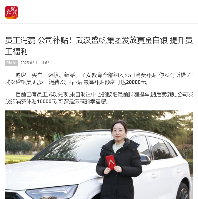 購房、買車、裝修、結(jié)婚、子女教育全部納入公司消費(fèi)補(bǔ)貼,這是武漢盛帆集團(tuán)推出的一項創(chuàng)新舉措,最高補(bǔ)貼額度可達(dá)20000元···