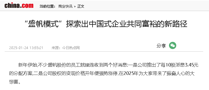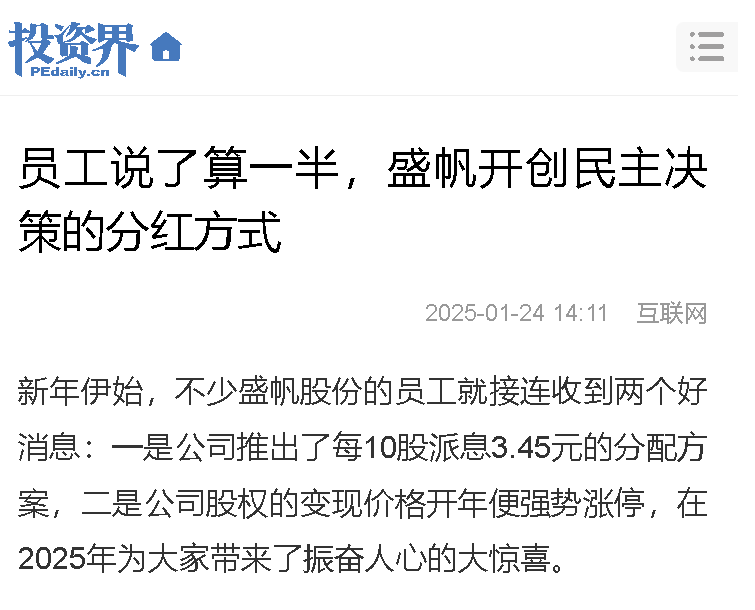 新年伊始,不少盛帆股份的員工就接連收到兩個(gè)好消息:一是公司推出了每10股派息3.45元的分配方案,二是公司股權(quán)的變現(xiàn)價(jià)格開···
