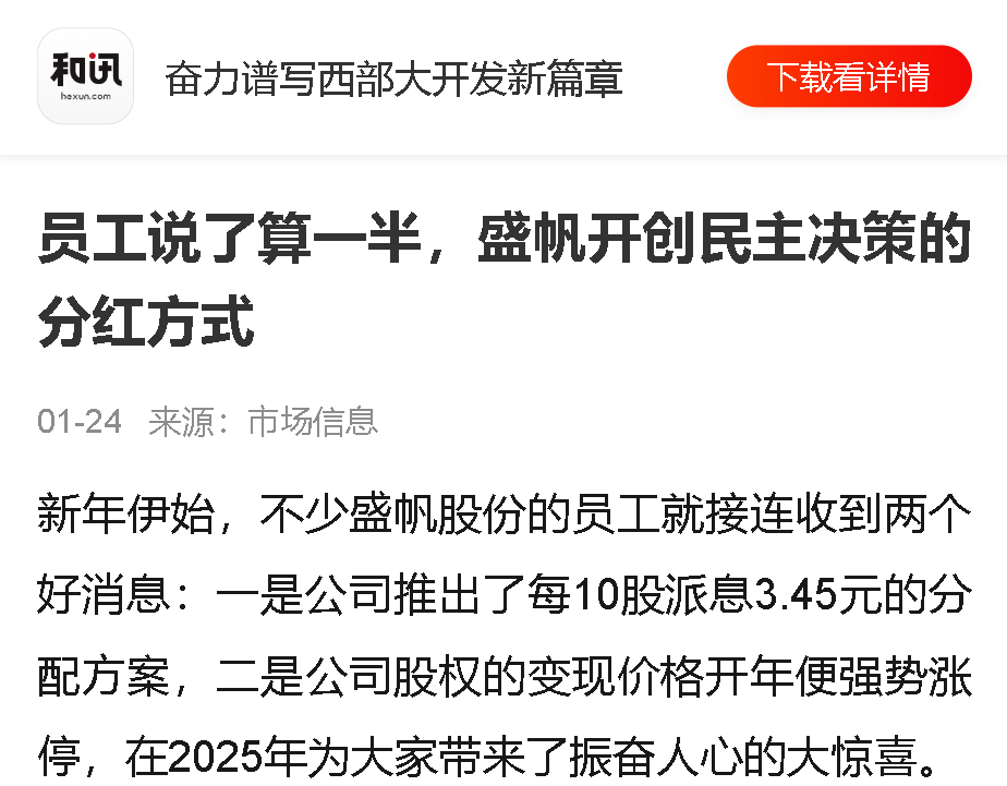 新年伊始,不少盛帆股份的員工就接連收到兩個(gè)好消息:一是公司推出了每10股派息3.45元的分配方案,二是公司股權(quán)的變現(xiàn)價(jià)···