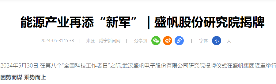 2024年5月30日,在第八個“全國科技工作者日”之際,武漢盛帆電子股份有限公司研究院揭牌儀式在盛帆集團隆重舉行。盛帆集···