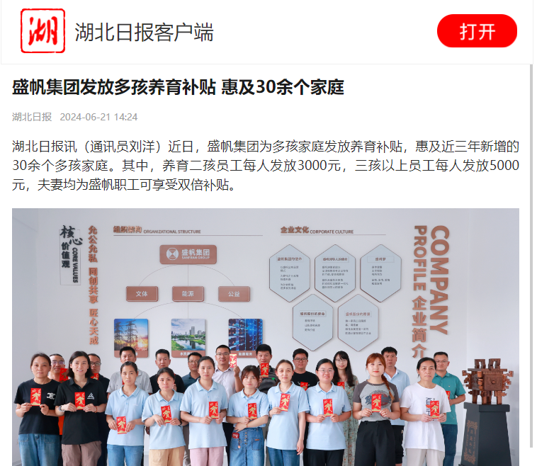 湖北日報訊(通訊員劉洋)近日,盛帆集團為多孩家庭發(fā)放養(yǎng)育補貼,惠及近三年新增的30余個多孩家庭。其中,養(yǎng)育二孩員工···